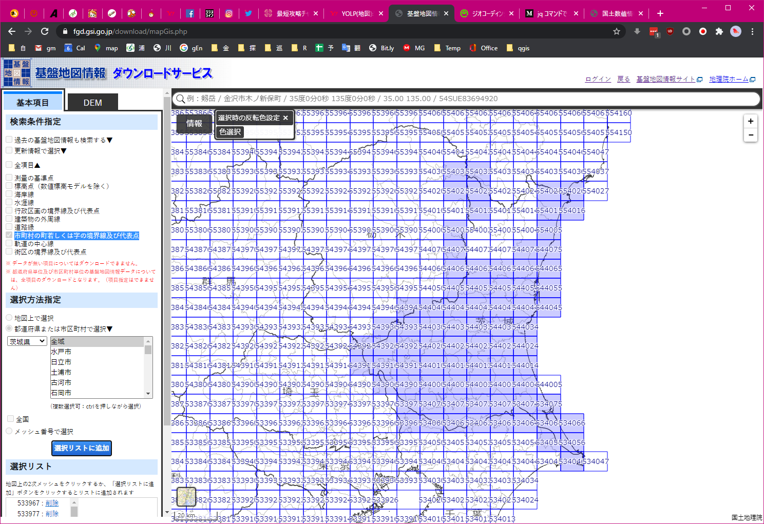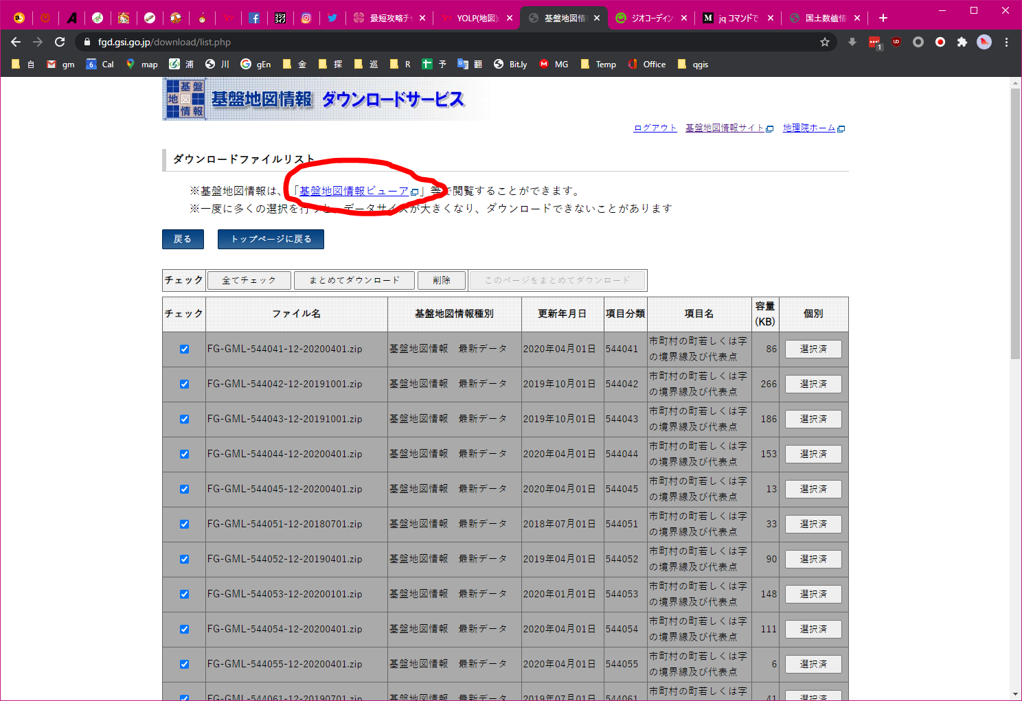 - 基盤地図情報ダウンロードサービス から(全項目じゃなくて)「市町村の町若しくは字の境界線及び代表点」をお好きな単位でダウンロードします(都道府県くらいがおすすめ)