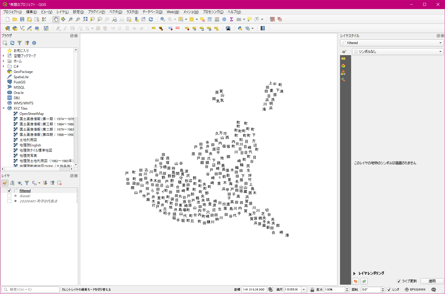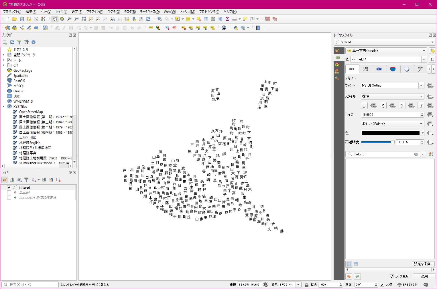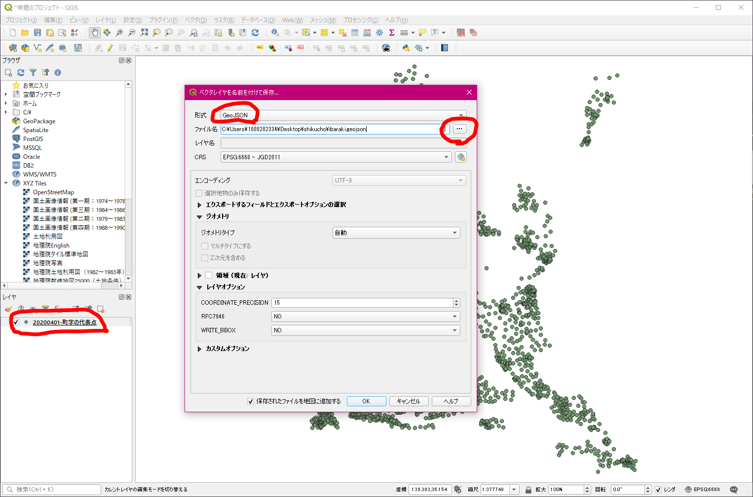 - QGISでシェープファイル「町字の代表点」を読み込ませ、geojson形式でエクスポートします