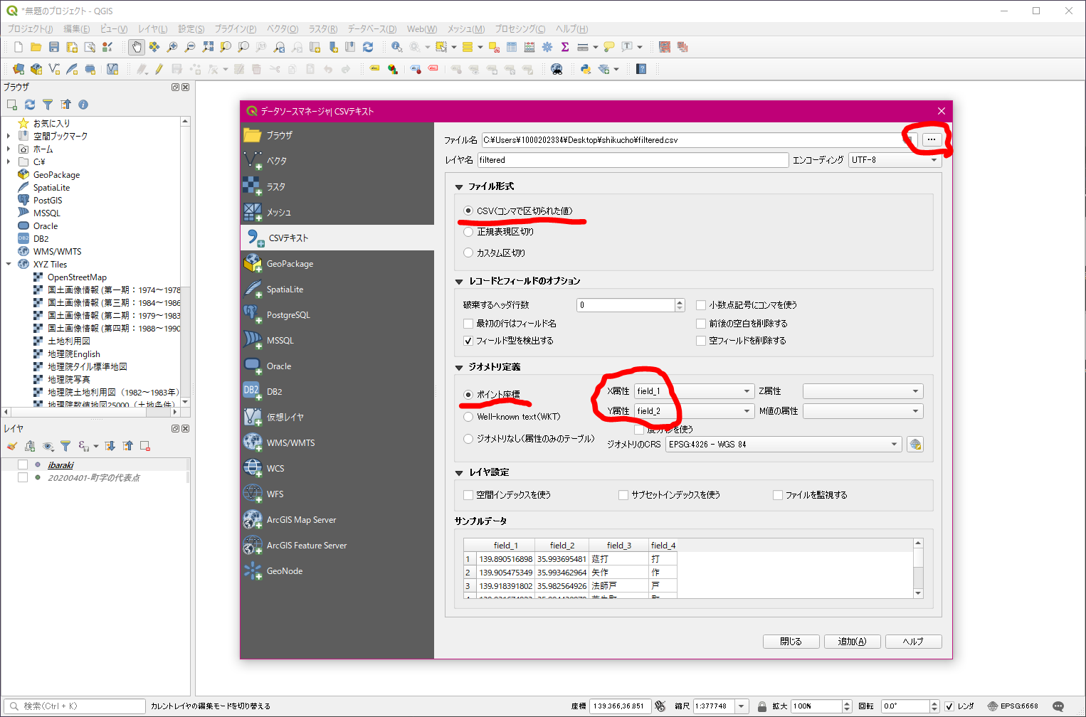- QGISでCSVファイルをインポートします