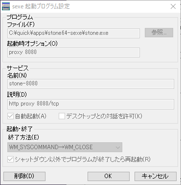 こんなふうに sexe で stone を起動してあげると、母艦PCのすべてのアドレス:8080にhttp proxyがサービスとして立ち上がります
